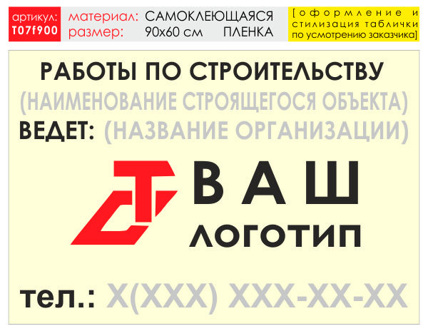 Баннер «Работы по строительству», T07 (самоклеящаяся плёнка, 90х60 см) в Альметьевске купить