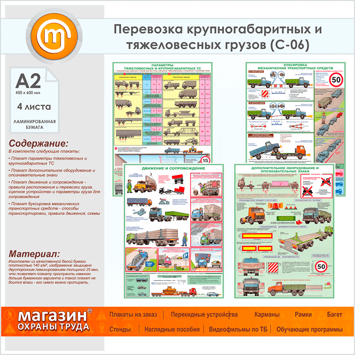 Плакаты «Перевозка крупногабаритных и тяжеловесных грузов» (С-06, ламинированная бумага, А2, 4 листа) в Альметьевске купить