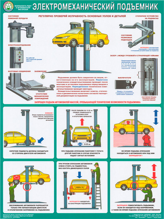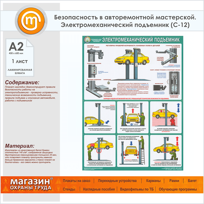 Плакат «Безопасность в авторемонтной мастерской. Электромеханический подъемник» (С-12, ламинированная бумага, А2, 1 лист) в Альметьевске купить