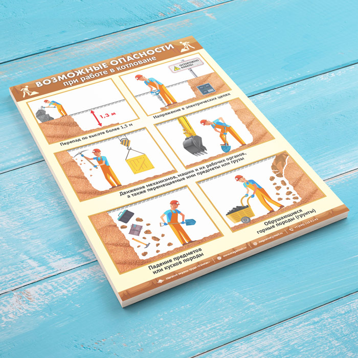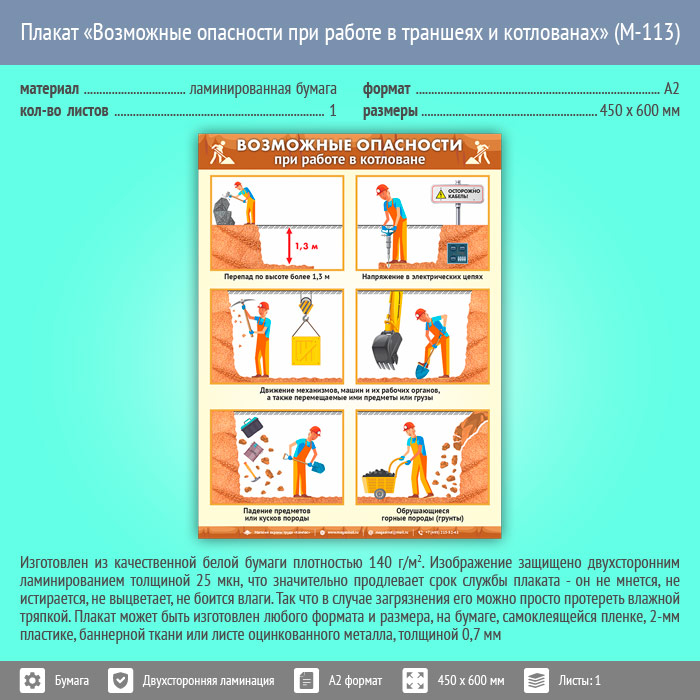 Плакат «Возможные опасности при работе в траншеях и котлованах» (М-113, ламинированная бумага, А2, 1 лист) в Альметьевске купить