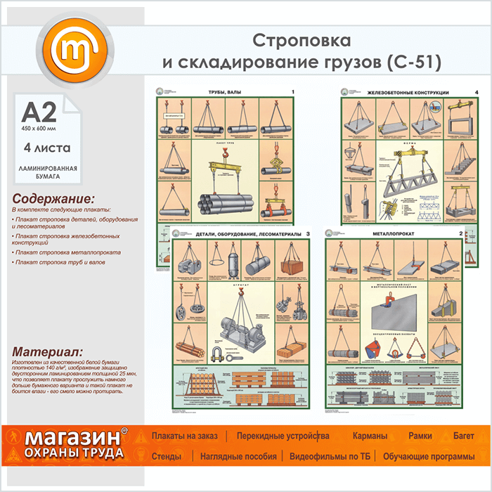 Плакаты «Строповка и складирование грузов» (С-51, ламинированная бумага, А2, 4 листа) в Альметьевске купить