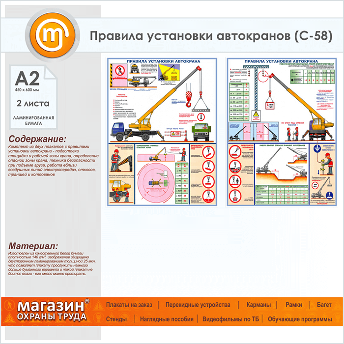 Плакаты «Правила установки автокранов» (С-58, ламинированная бумага, А2, 2 листа) в Альметьевске купить