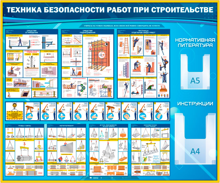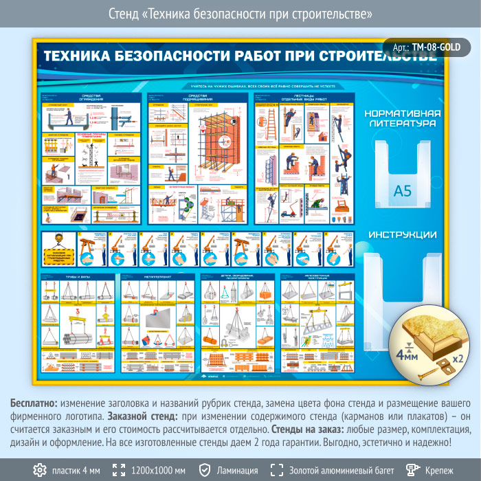 Стенд «Техника безопасности при строительстве» с 2 объемными карманами (TM-08-GOLD) в Альметьевске купить