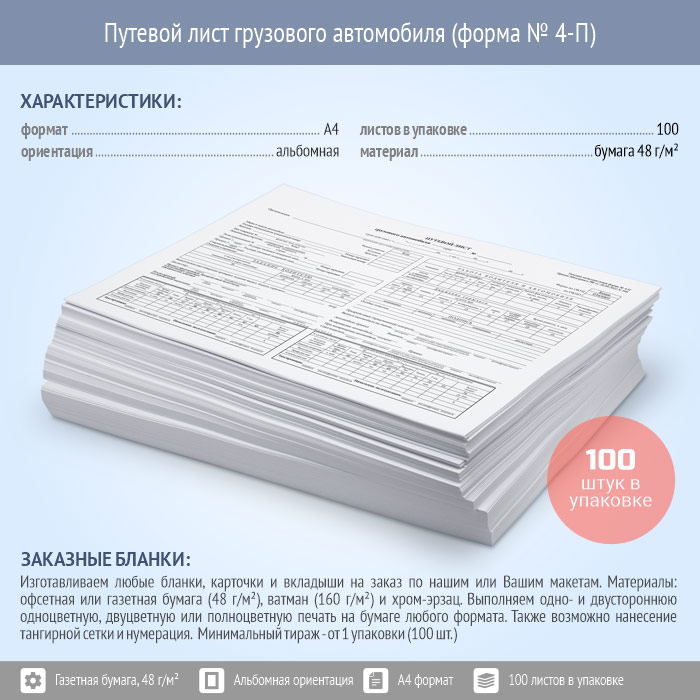 Путевой лист грузового автомобиля (форма № 4-П, упаковка из 100 штук) в Альметьевске купить