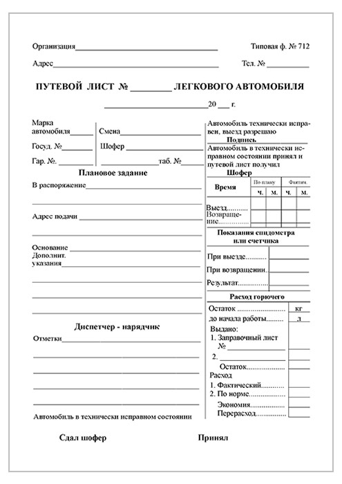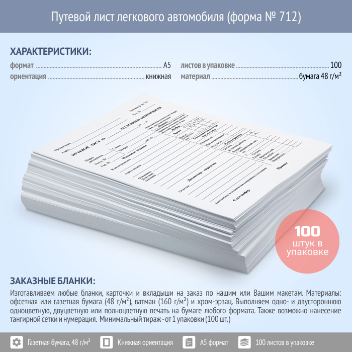 Путевой лист легкового автомобиля (форма № 712, упаковка из 100 штук) в Альметьевске купить