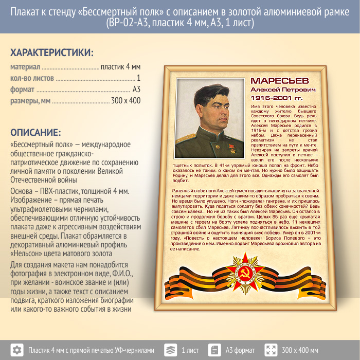 Плакат к стенду «Бессмертный полк» с описанием в золотой (матовой) алюминиевой рамке (BP-02-A3, пластик 4 мм, А3, 1 лист) в Альметьевске купить