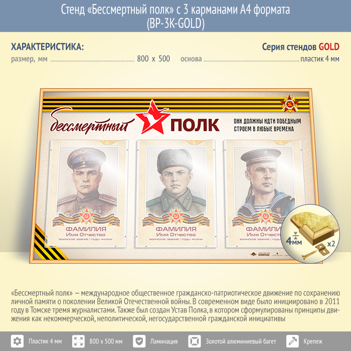 Стенд «Бессмертный полк» с 3 карманами А4 формата (BP-3K-GOLD) в Альметьевске купить
