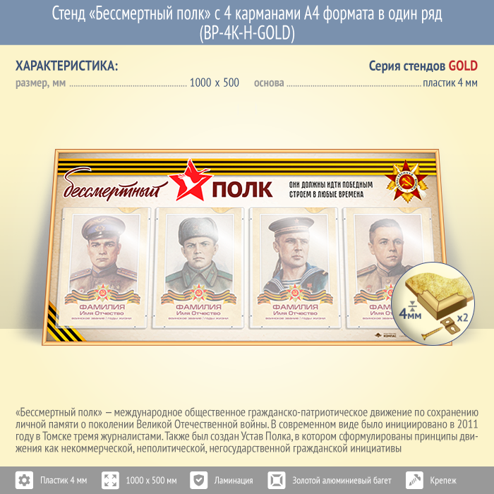 Стенд «Бессмертный полк» с 4 карманами А4 формата в один ряд (BP-4K-H-GOLD) в Альметьевске купить