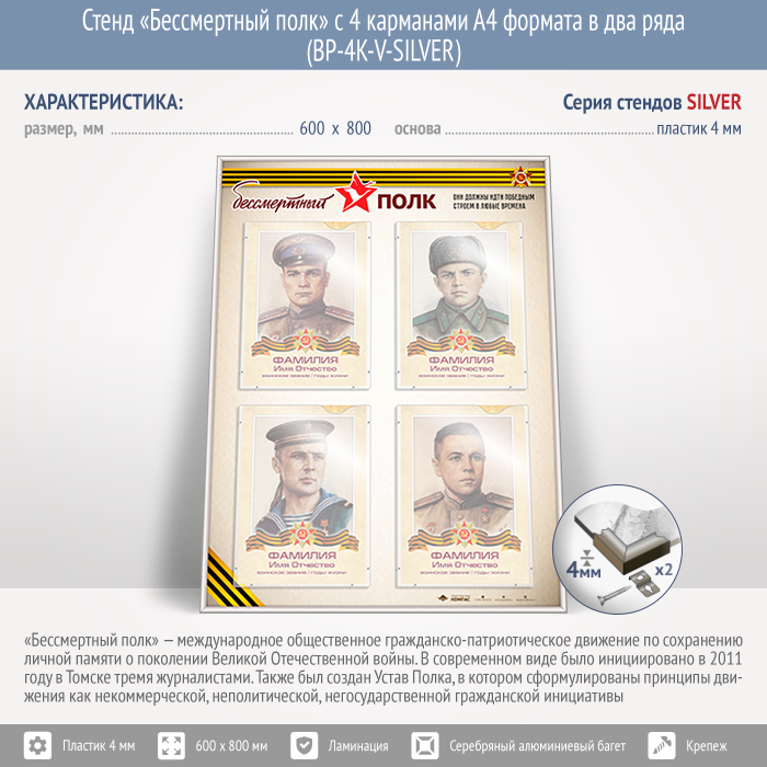 Стенд «Бессмертный полк» с 4 карманами А4 формата в два ряда (BP-4K-V-SILVER) в Альметьевске купить