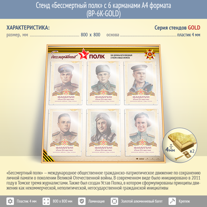 Стенд «Бессмертный полк» с 6 карманами А4 формата (BP-6K-GOLD) в Альметьевске купить