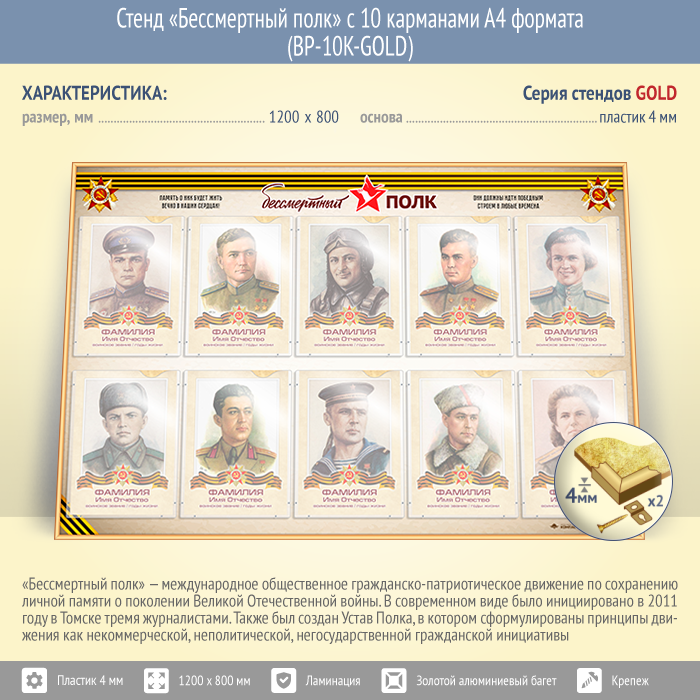 Стенд «Бессмертный полк» с 10 карманами А4 формата (BP-10K-GOLD) в Альметьевске купить