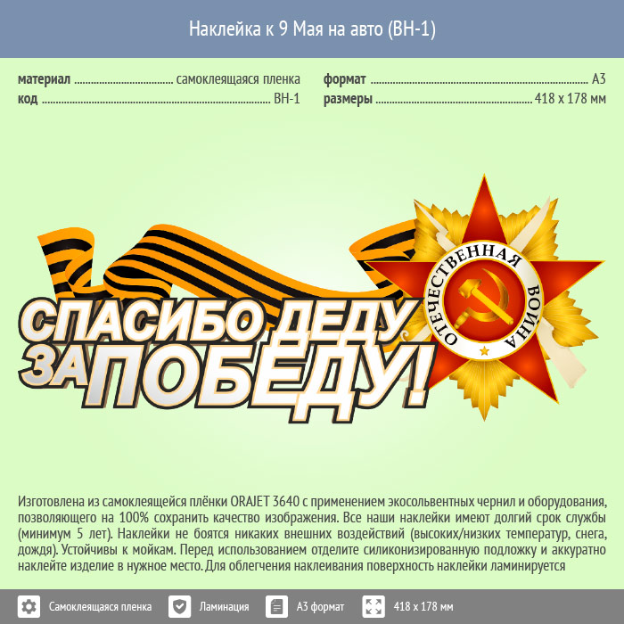 Наклейка к 9 Мая на авто А3 формата (BH-1) в Альметьевске купить