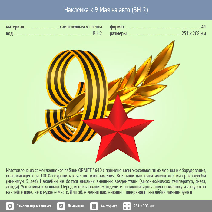 Наклейка к 9 Мая на авто А4 формата (BH-2) в Альметьевске купить