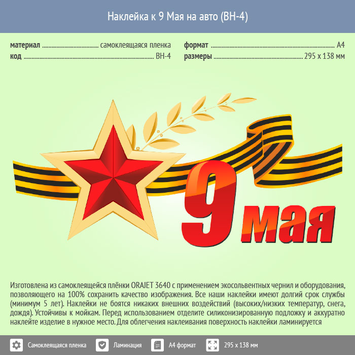 Наклейка к 9 Мая на авто А4 формата (BH-4) в Альметьевске купить