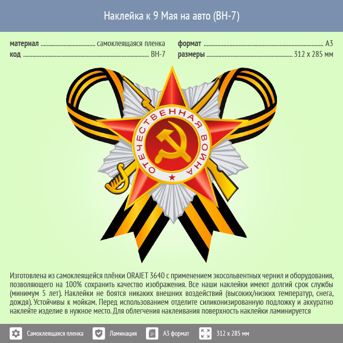Наклейка к 9 Мая на авто А3 формата (BH-7) в Альметьевске купить