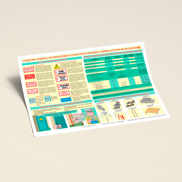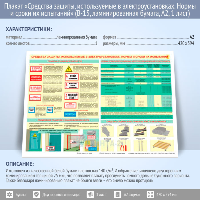 Плакат «Средства защиты, используемые в электроустановках. Нормы и сроки их испытаний» (В-15, ламинированная бумага, А2, 1 лист) в Альметьевске купить