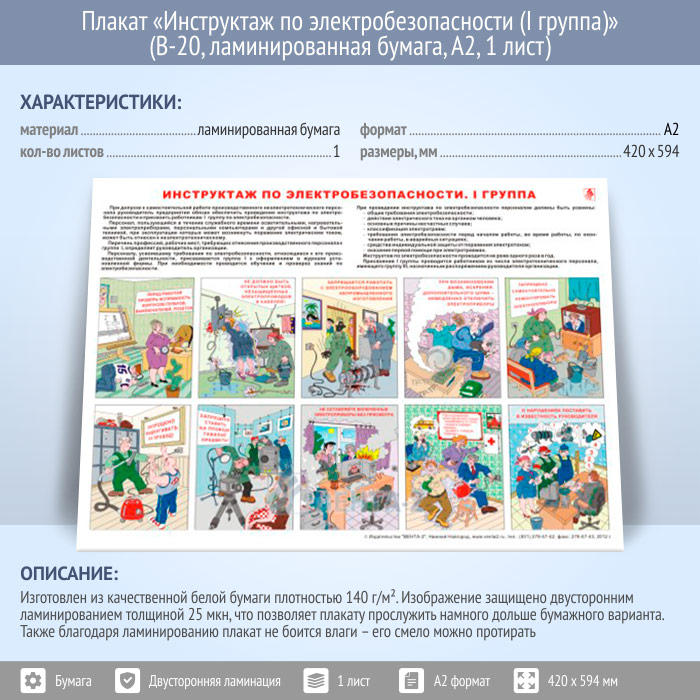 Плакат «Инструктаж по электробезопасности (I группа)» (В-20, ламинированная бумага, А2, 1 лист) в Альметьевске купить