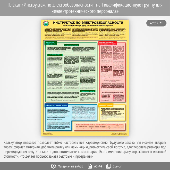 Плакат «Инструктаж по электробезопасности - на I квалификационную группу для неэлектротехнического персонала» (С-71, 1 лист) в Альметьевске купить