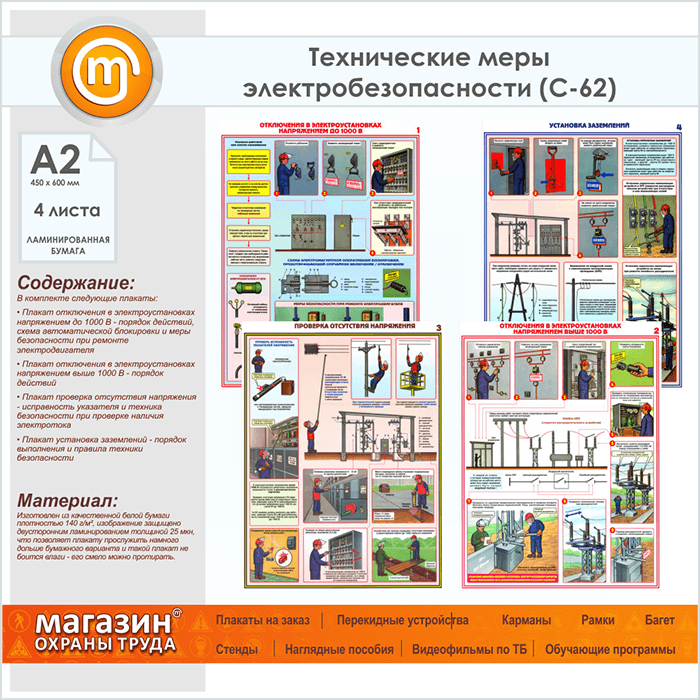 Плакаты «Технические меры электробезопасности» (С-62, ламинированная бумага, А2, 4 листа) в Альметьевске купить