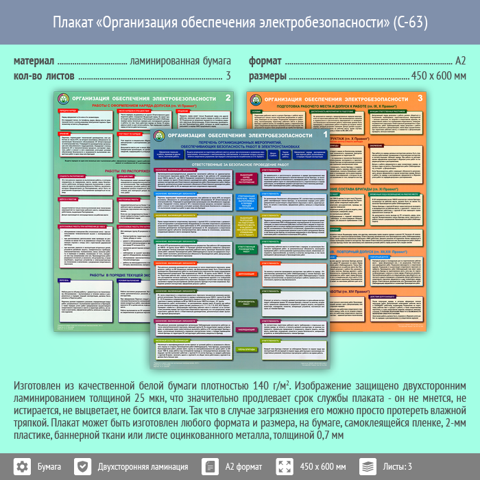 Плакаты «Организация обеспечения электробезопасности» (С-63, ламинированная бумага, А2, 3 листа) в Альметьевске купить