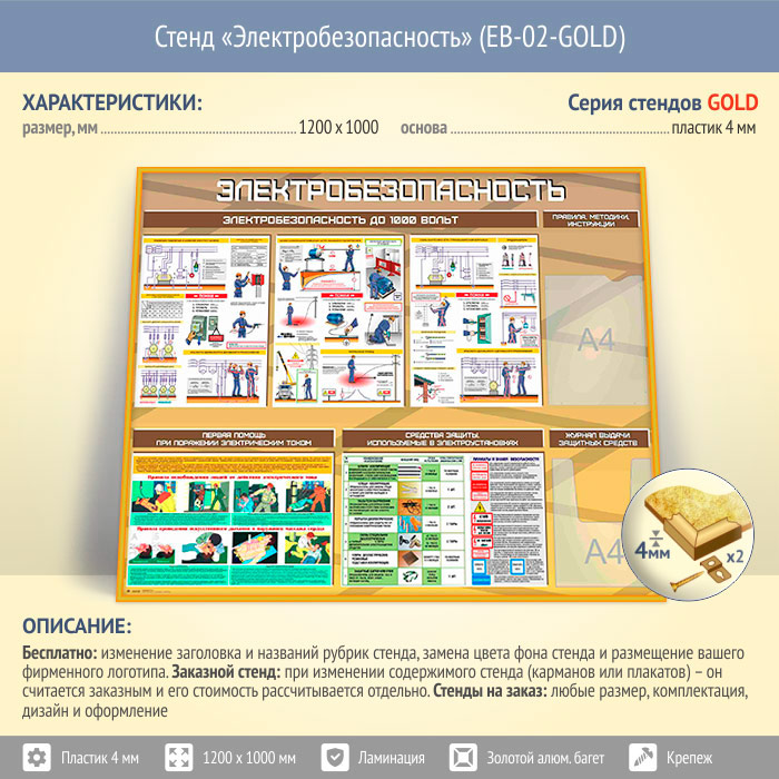 Стенд «Электробезопасность до 1000 вольт» с плоским и объемным карманами (EB-02-GOLD) в Альметьевске купить