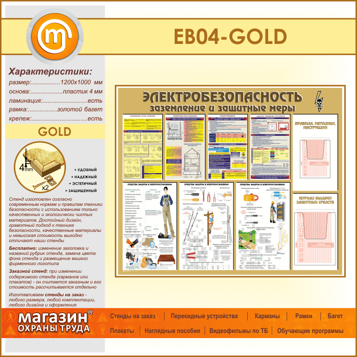 Стенд «Электробезопасность. Заземление и защитные меры» с 2 объемными карманами (EB-04-GOLD) в Альметьевске купить