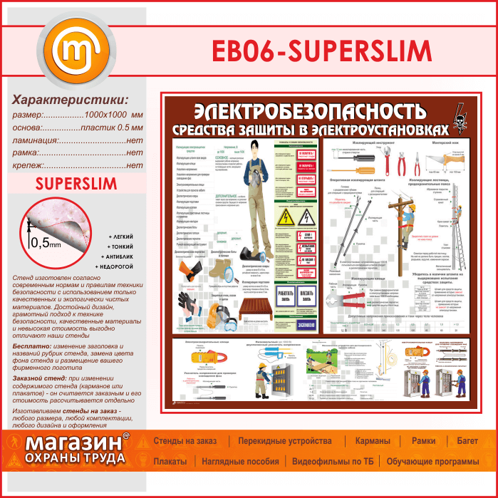 Стенд «Электробезопасность. Средства защиты в электроустановках» (EB-06-SUPERSLIM) в Альметьевске купить