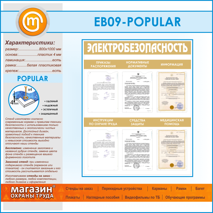 Стенд «Электробезопасность» с 6 карманами (EB-09-POPULAR) в Альметьевске купить