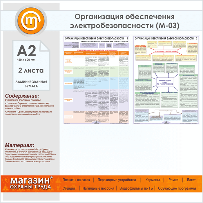 Плакаты «Организация обеспечения электробезопасности» (М-03, ламинированная бумага, А2, 2 листа) в Альметьевске купить