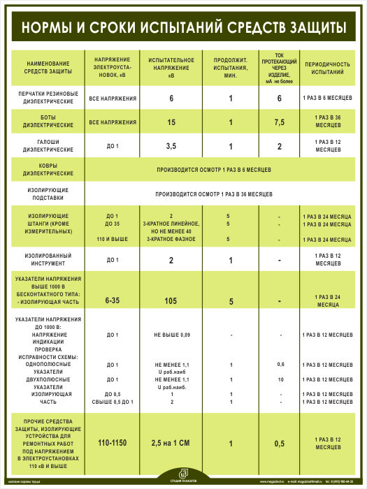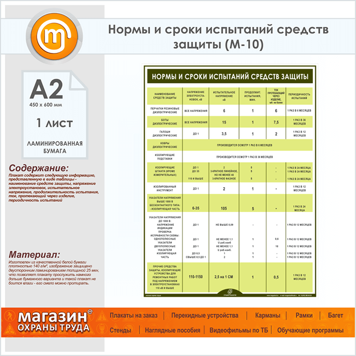 Плакат «Нормы и сроки испытаний средств защиты» (М-10, ламинированная бумага, А2, 1 лист) в Альметьевске купить