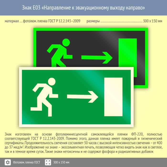 Знак E03 «Направление к эвакуационному выходу направо» (фотолюминесцентная пленка ГОСТ 34428-2018, 300х150 мм) в Альметьевске купить