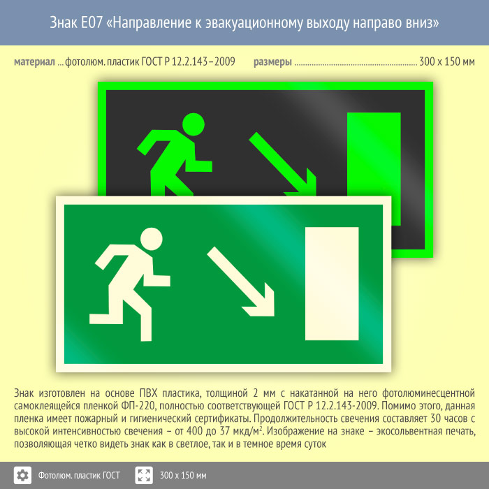 Знак E07 «Направление к эвакуационному выходу направо вниз» (фотолюминесцентный пластик ГОСТ 34428-2018, 300х150 мм) в Альметьевске купить