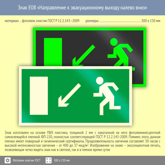 Знак E08 «Направление к эвакуационному выходу налево вниз» (фотолюминесцентный пластик ГОСТ 34428-2018, 300х150 мм) в Альметьевске купить