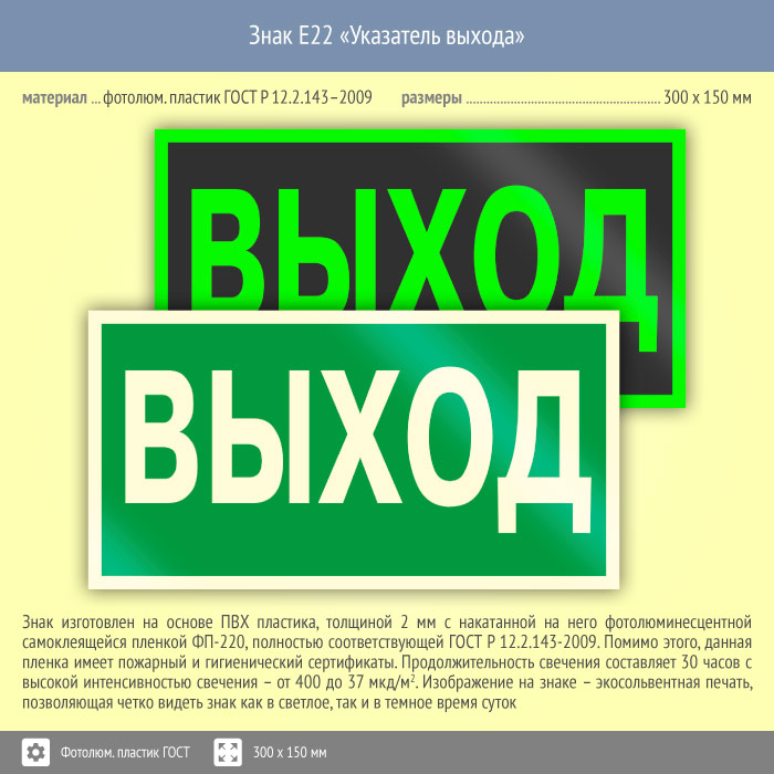 Знак E22 «Указатель выхода» (фотолюминесцентный пластик ГОСТ 34428-2018, 300х150 мм) в Альметьевске купить