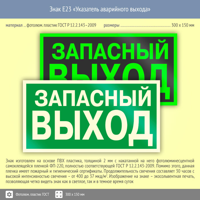Знак E23 «Указатель запасного выхода» (устаревший) (фотолюминесцентный пластик ГОСТ 34428-2018, 300х150 мм) в Альметьевске купить