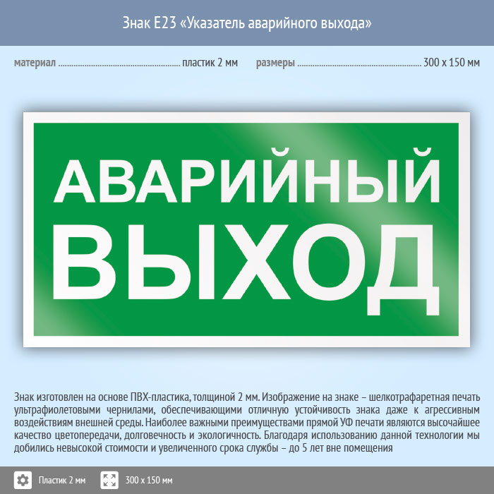Знак E23 «Указатель аварийного выхода» (пластик, 300х150 мм) в Альметьевске купить