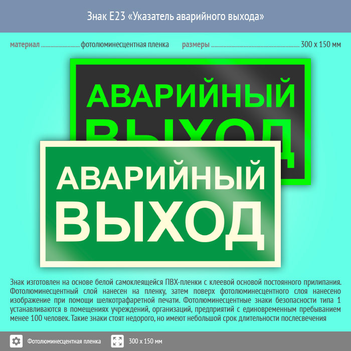 Знак E23 «Указатель аварийного выхода» (фотолюминесцентная пленка, 300х150 мм) в Альметьевске купить