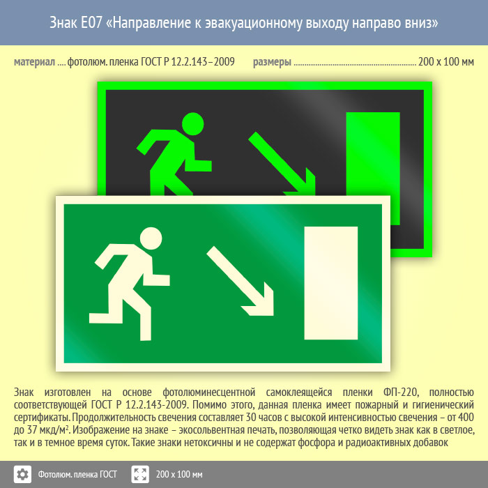 Знак E07 «Направление к эвакуационному выходу направо вниз» (фотолюминесцентная пленка ГОСТ 34428-2018, 200х100 мм) в Альметьевске купить