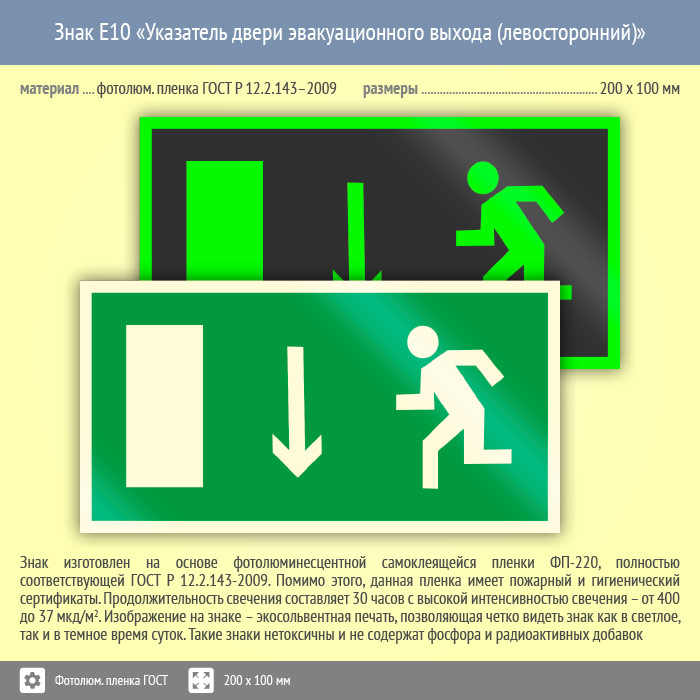 Знак E10 «Указатель двери эвакуационного выхода (левосторонний)» (фотолюминесцентная пленка ГОСТ 34428-2018, 200х100 мм) в Альметьевске купить