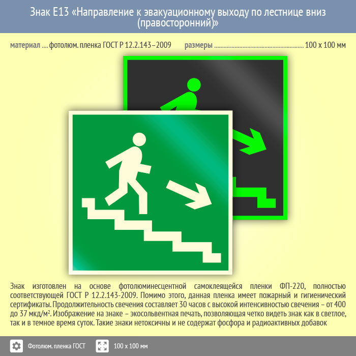 Знак E13 «Направление к эвакуационному выходу по лестнице вниз (правосторонний)» (фотолюминесцентная пленка ГОСТ 34428-2018, 100х100 мм) в Альметьевске купить