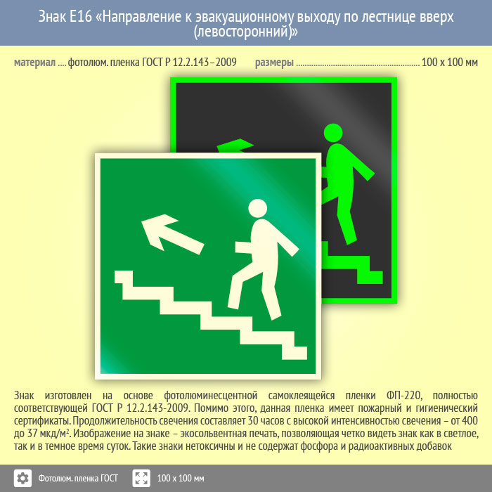 Знак E16 «Направление к эвакуационному выходу по лестнице вверх (левосторонний)» (фотолюминесцентная пленка ГОСТ 34428-2018, 100х100 мм) в Альметьевске купить
