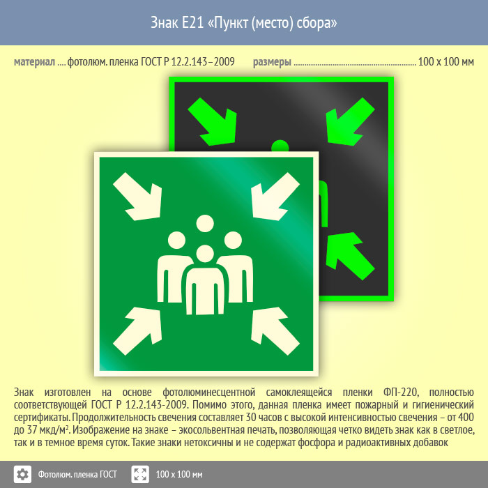 Знак E21 «Пункт (место) сбора» (фотолюминесцентная пленка ГОСТ 34428-2018, 100х100 мм) в Альметьевске купить