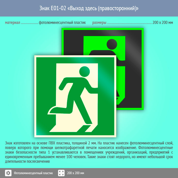 Знак E01-02 «Выход здесь (правосторонний)» (фотолюминесцентный пластик, 200х200 мм) в Альметьевске купить