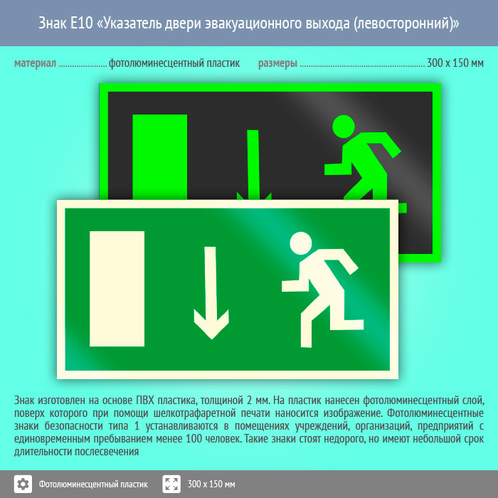 Знак E10 «Указатель двери эвакуационного выхода (левосторонний)» (фотолюминесцентный пластик, 300х150 мм) в Альметьевске купить