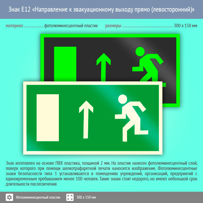Знак E12 «Направление к эвакуационному выходу прямо (левосторонний)» (фотолюминесцентный пластик, 300х150 мм) в Альметьевске купить