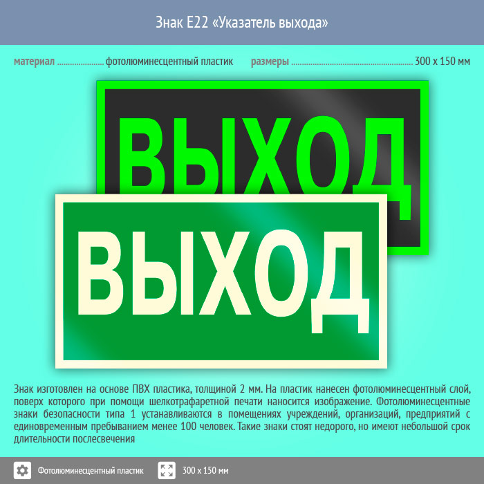 Знак E22 «Указатель выхода» (фотолюминесцентный пластик, 300х150 мм) в Альметьевске купить