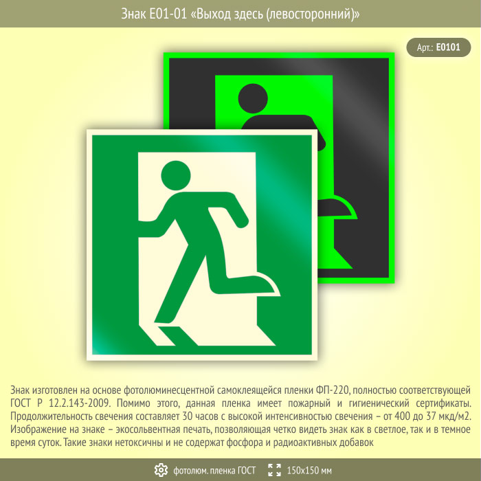 Знак E01-01 «Выход здесь (левосторонний)» (фотолюминесцентная пленка ГОСТ 34428-2018, 150х150 мм) в Альметьевске купить