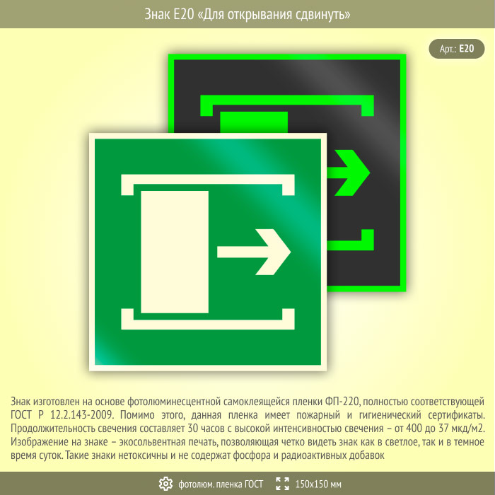 Знак E20 «Для открывания сдвинуть» (фотолюминесцентная пленка ГОСТ 34428-2018, 150х150 мм) в Альметьевске купить