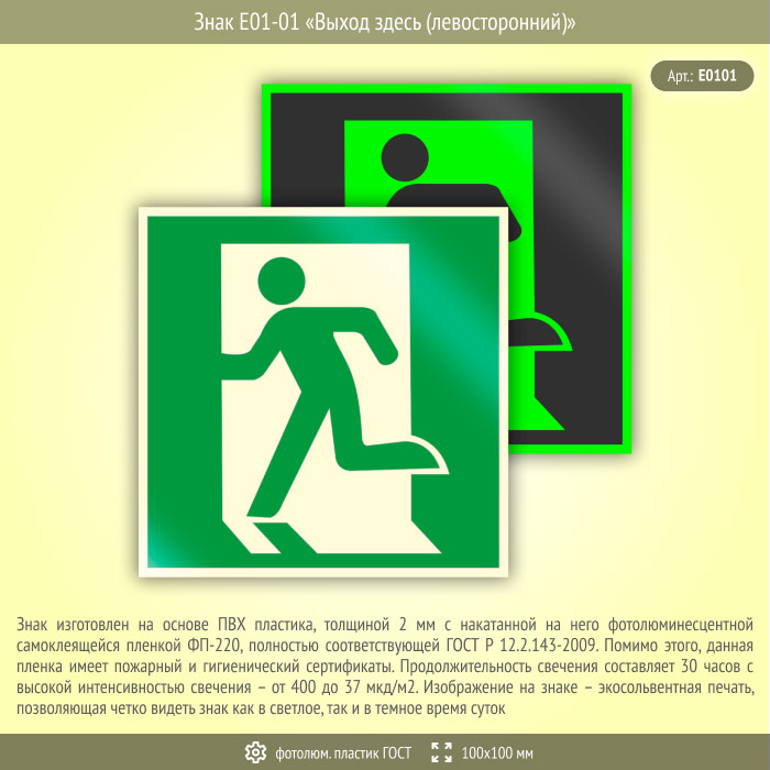 Знак E01-01 «Выход здесь (левосторонний)» (фотолюминесцентный пластик ГОСТ 34428-2018, 100х100 мм) в Альметьевске купить
