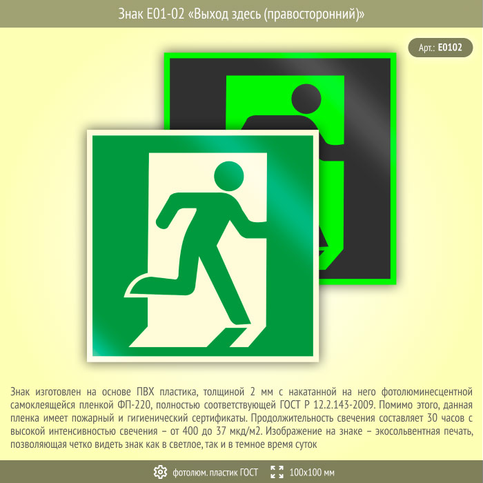 Знак E01-02 «Выход здесь (правосторонний)» (фотолюминесцентный пластик ГОСТ 34428-2018, 100х100 мм) в Альметьевске купить